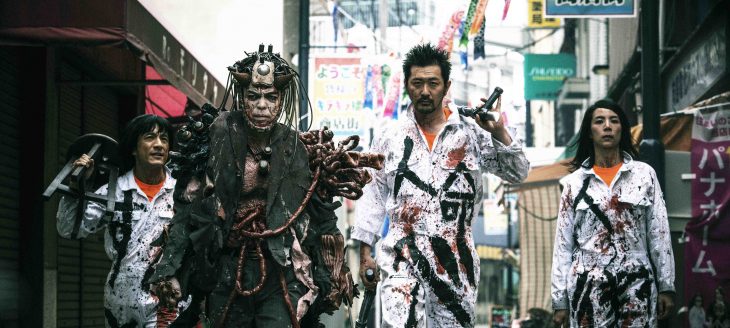 Oh Japan, land of the blossoming cherry trees, tea ceremonies, and all the brain-melting splatter epics. Yoshihiro Nishimura, virtuoso of effects and director, goes all out with the long-anticipated continuation of the cult film “Meatball Machine” (2005), serving up the apotheosis of J-Gore cinema. A gigantic bell jar hurtles from outer space directly toward Tokyo. Anyone unfortunate enough to be sitting under it soon jumps literally out of their skin. Extraterrestrial parasites implant themselves in human brains and stimulate the body to spectacular transformations. Flesh, muscles and metal become one, until human motorcycles (!) race through the streets firing MG rounds from their nipples. In this masterpiece Nishimura condenses motifs and aesthetics of the Japanese gore cinema into an ultimate and completely overheated special-effects transcendence: a Grand Guignol blood opera in frenetically mounted images and avant-gardist radicality, stuffed so full with madness and creativity that eyeballs will still be rolling even hours after the end of the film.